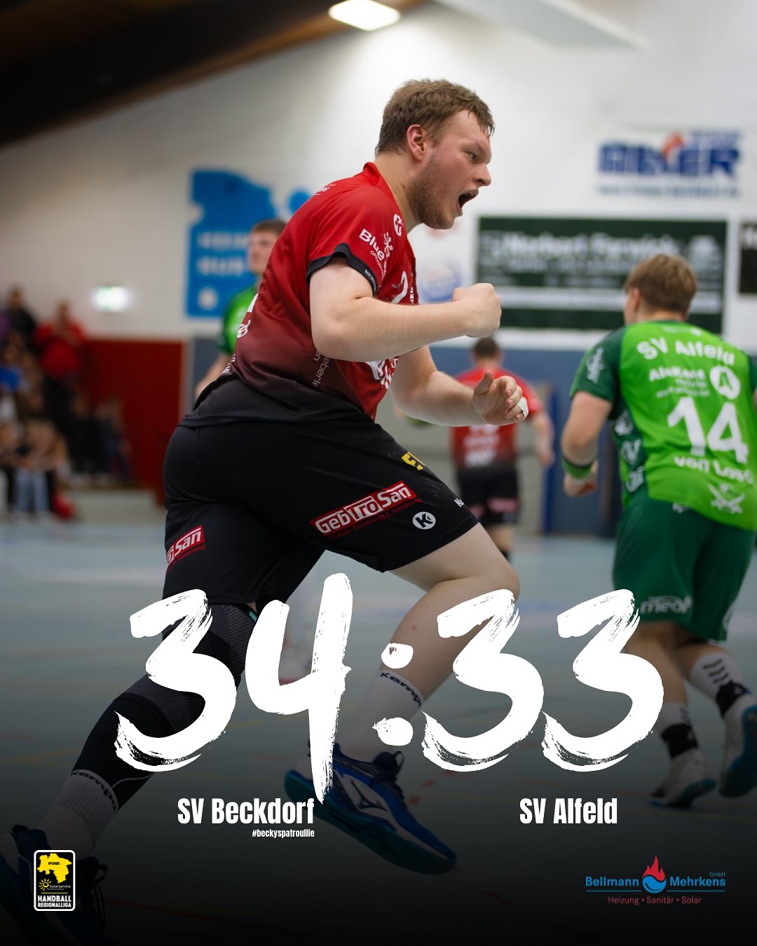 Der SV Beckdorf hat sein zweites Heimspiel der Saison gewonnen – und wie! Vor heimischem Publikum feierte die Mannschaft von Trainer Robert Frahm einen hart erkämpften 34:33-Sieg gegen den SV Alfeld. Damit steht Beckdorf nun mit 4:2 Punkten auf dem siebten Tabellenplatz. Besonders erfreulich: Es ist der erste Erfolg der Beckdorfer gegen die „Piraten von der Leine“ überhaupt.