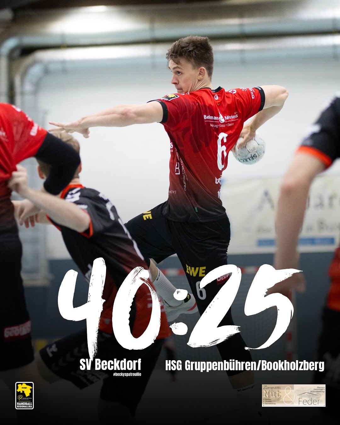 [Nachtrag] Der SV Beckdorf hat seinen bisher höchsten Sieg in der Vereinsgeschichte gefeiert. Vor heimischem Publikum setzte sich die Mannschaft von Trainer Robert Frahm souverän mit 40:25 gegen die HSG Grüppenbühren/Bookholzberg durch.